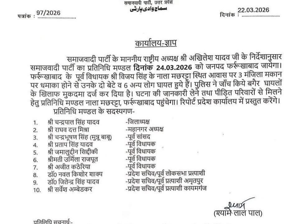 फर्रुखाबाद :- पूर्व विधायक विजय सिंह के आवास पर 17 मार्च को हुए विस्फोट के बाद समाजवादी पार्टी (सपा) का...