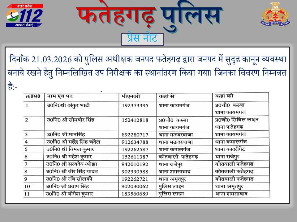 फर्रुखाबाद :- पुलिस विभाग में प्रशासनिक व्यवस्था को और सुदृढ़ बनाने के उद्देश्य से पुलिस अधीक्षक आरती सिंह ने बीती...