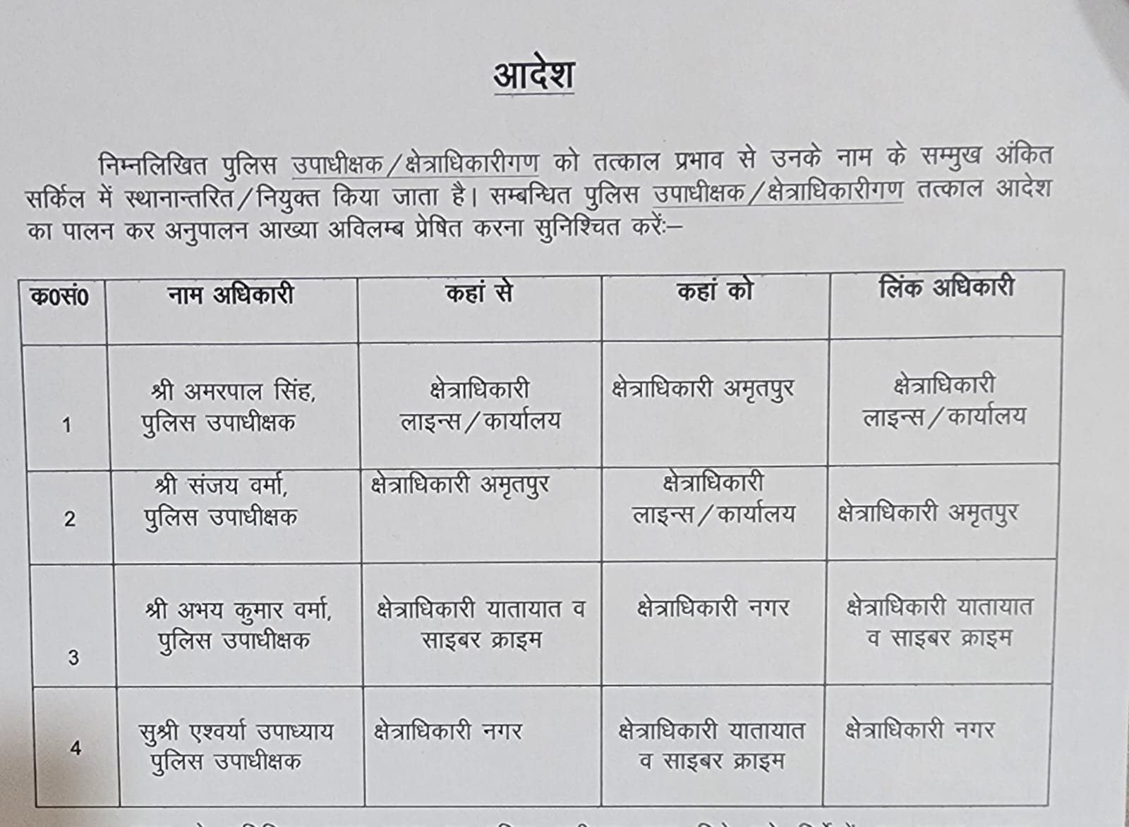 फर्रुखाबाद :- पुलिस अधीक्षक श्रीमती आरती सिंह ने कानून व्यवस्था को दुरुस्त करने के लिए क्षेत्राधिकारियों का आपस में तबादला कर दिया है।क्षेत्राधिकारी नगर ऐश्वर्या उपाध्याय को क्षेत्राधिकारी यातायात व साइबर क्राइम बनाया गया है। पुलिस उपाधीक्षक अमरपाल सिंह क्षेत्राधिकारी लाइंस कार्यालय का तबादला सीओ अमृतपुर के पद पर किया गया। पुलिस उपाधीक्षक संजय वर्मा को लाइंस कार्यालय की जिम्मेदारी सौंपी गई।पुलिस उपाधीक्षक अभय कुमार को क्षेत्राधिकारी यातायात व साइबर क्राइम का सीओ सिटी बनाया गया है।