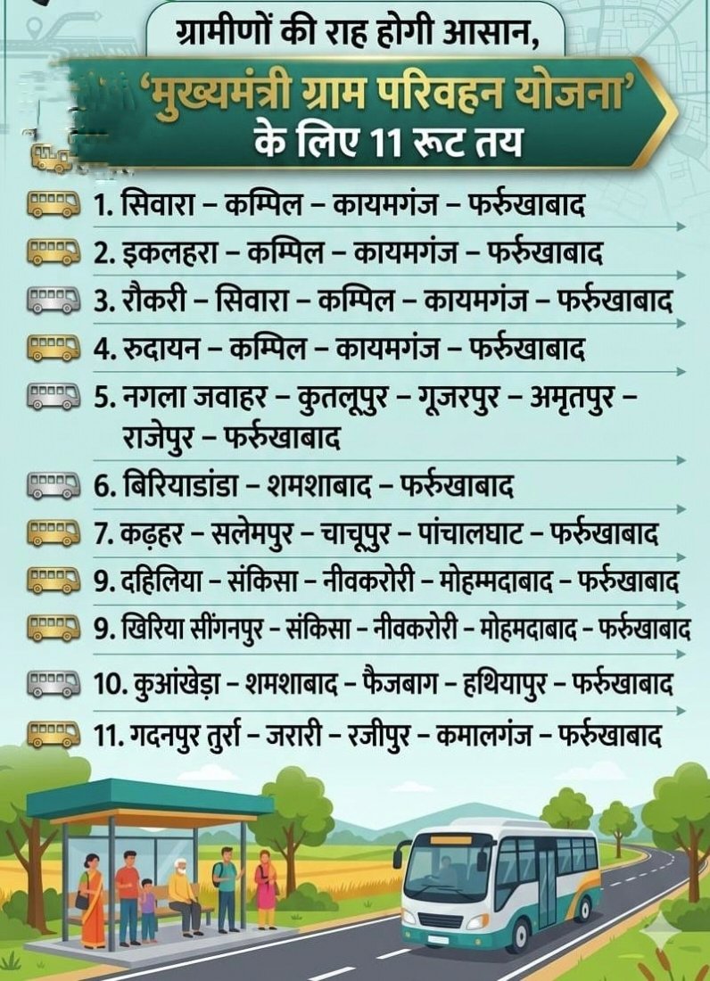 फर्रुखाबाद :- जिला प्रशासन ने गांव में बस सेवा के लिए मार्गो का निर्धारण कर दिया है। मुख्यमंत्री ग्राम परिवहन योजना के प्रभावी क्रियान्वयन के संबंध में आज जिला अधिकारी आशुतोष कुमार द्विवेदी की अध्यक्षता में कलेक्ट्रेट सभागार में गठित समिति की बैठक हुई।बैठक में सहायक संमभागीय परिवहन अधिकारी, मुख्य विकास अधिकारी सहित समिति के समस्त एवं आवेदक उपस्थित रहे।बैठक का आयोजन विशेष सचिव (परिवहन) के अनुपालन में किया गया।बैठक के दौरान प्राप्त आवेदनों पर विचार विमर्श करते हुए आवेदकों से विस्तृत चर्चा की गई तथा जनपद में ग्राम परिवहन सेवा के संचालन हेतु विभिन्न प्रस्तावित मार्ग पर